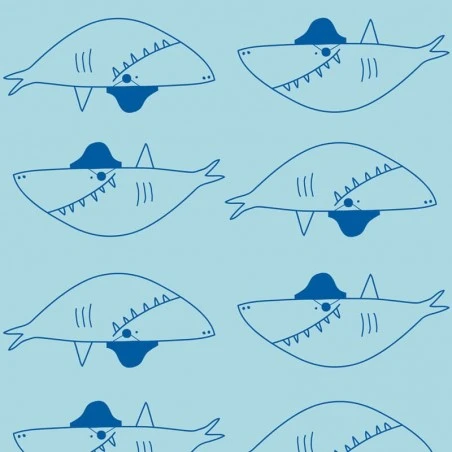El fondo de la tela es de un tono azul suave y la silueta de los tiburones es de un tono azul más subido, que hace un perfecto contraste con el fondo.