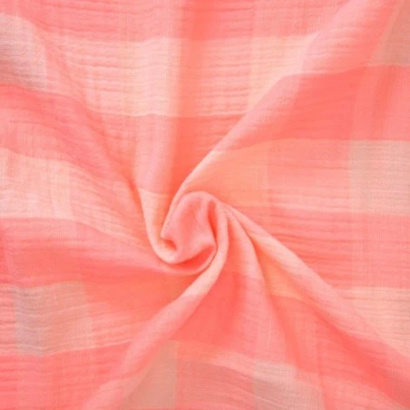 La Tela Muselina Vichy Katia – Fluor Square presenta un diseño de cuadros vichy en colores flúor, ofreciendo un tejido de doble capa con un grosor medio. Esta muselina de doble capa es suave y tiene cierto cuerpo, haciéndola perfecta para confeccionar camisas, sobre camisas o vestidos.