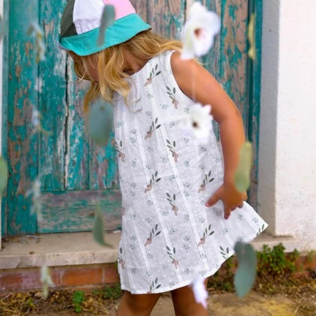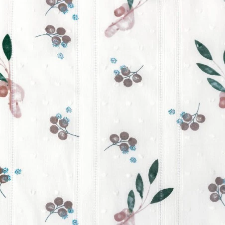 Presenta un diseño adorable que encantará a los más pequeños de la casa: un estampado de ornitorrincos volando entre flores y hojas. El fondo de la tela es blanco y presenta topos blancos en relieve, una característica típica de la tela plumeti.