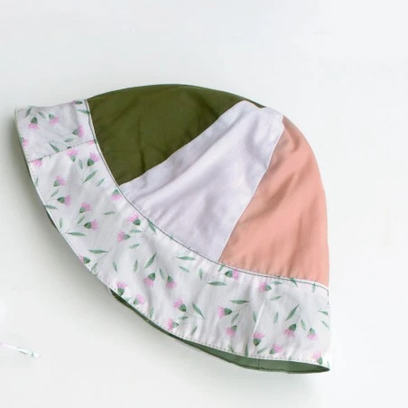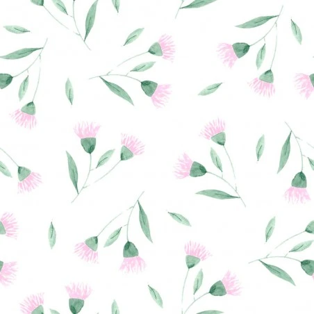 El estampado de esta tela se presenta sobre un fondo blanco y se inspira en antiguas flores australianas en tonos rosas y verdes.