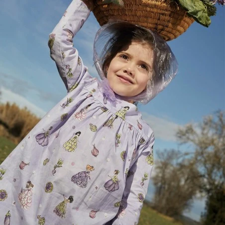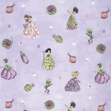La tela presenta un estampado de hadas de las hortalizas, unas divertidas muñecas que visten largos vestidos hechos de verdura. Unas visten vestidos de alcachofa, otras de berenjena, otras de cebolla… ¡Divertido y original! También encontrarás pequeñas verduras estampadas alrededor de ellas.