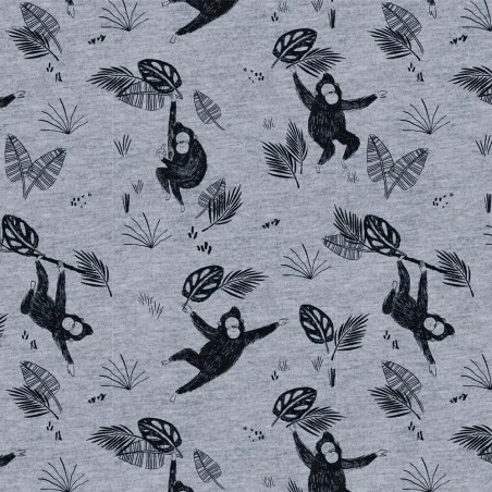 La Tela Summer Sweat Melange Katia Hanging Out Melange presenta un estampado de chimpancés y orangutanes jugando a saltar de rama en rama, un diseño divertido perfecto para los peques.