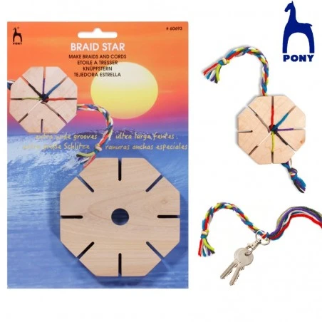 Telar para tejer trenzas Pony es una estrella tejedora que te permite realizar preciosos trenzados de hilo o lana, que podrás utilizar para crear elegantes cordones para utilizar como llaveros, diademas, cinturones, cualquier complemento de bisutería como collares y pulseras, y muchas más creaciones.
